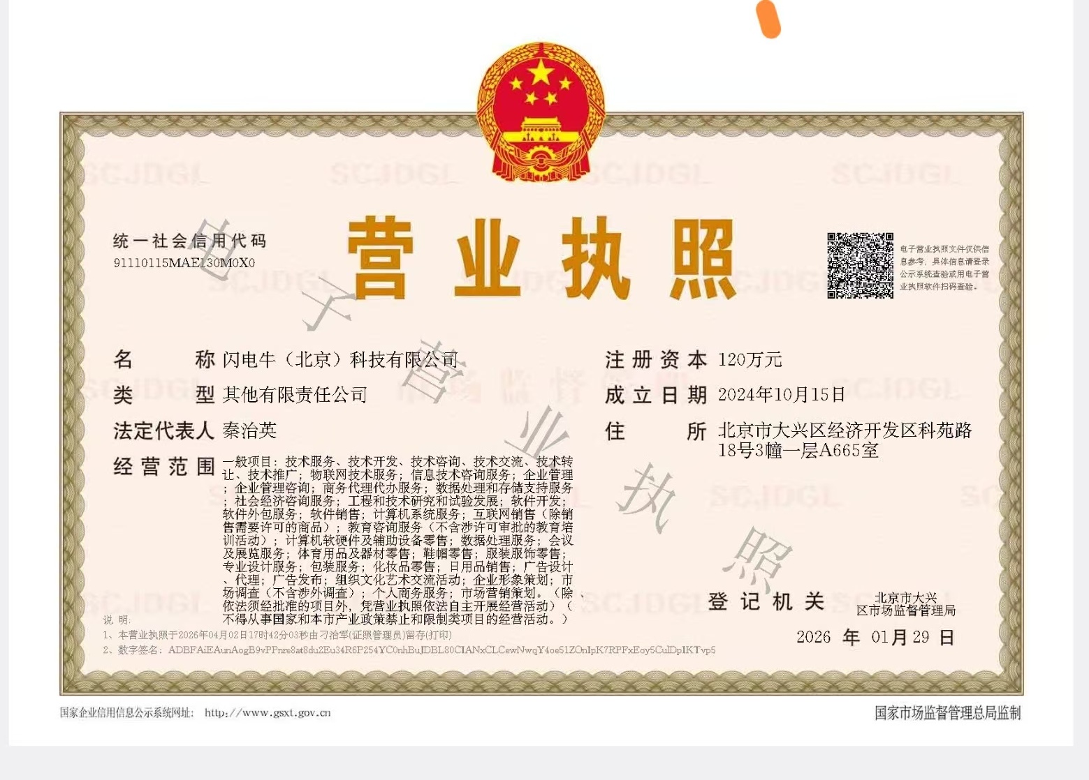 闪电牛(北京)科技有限公司营业执照,合法经营资质。
