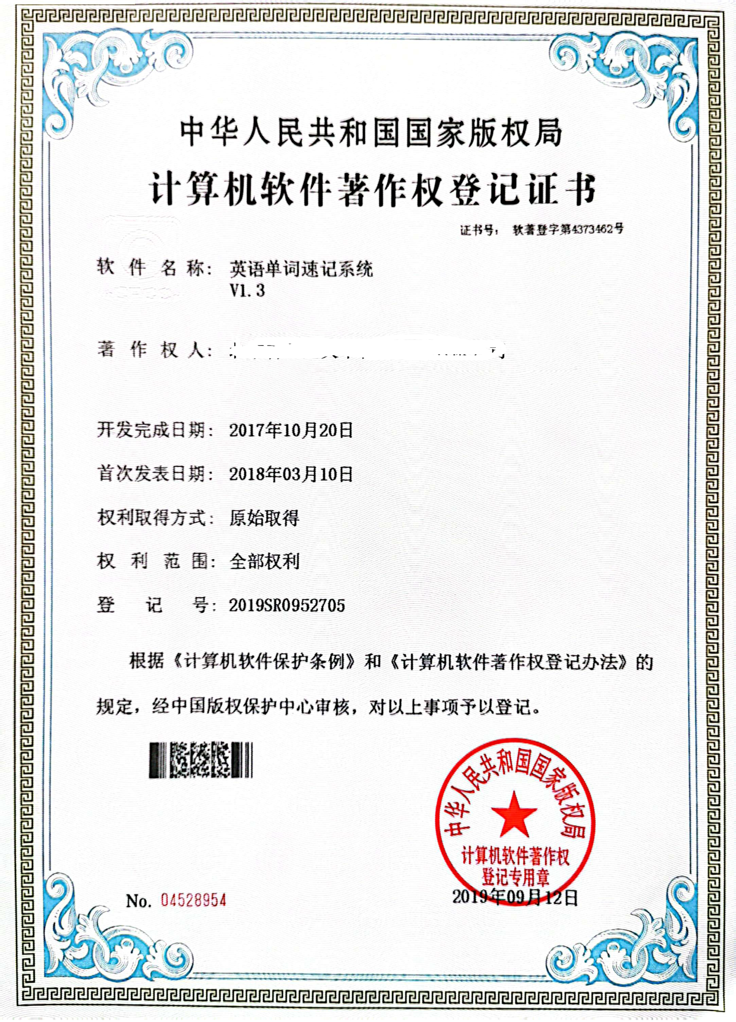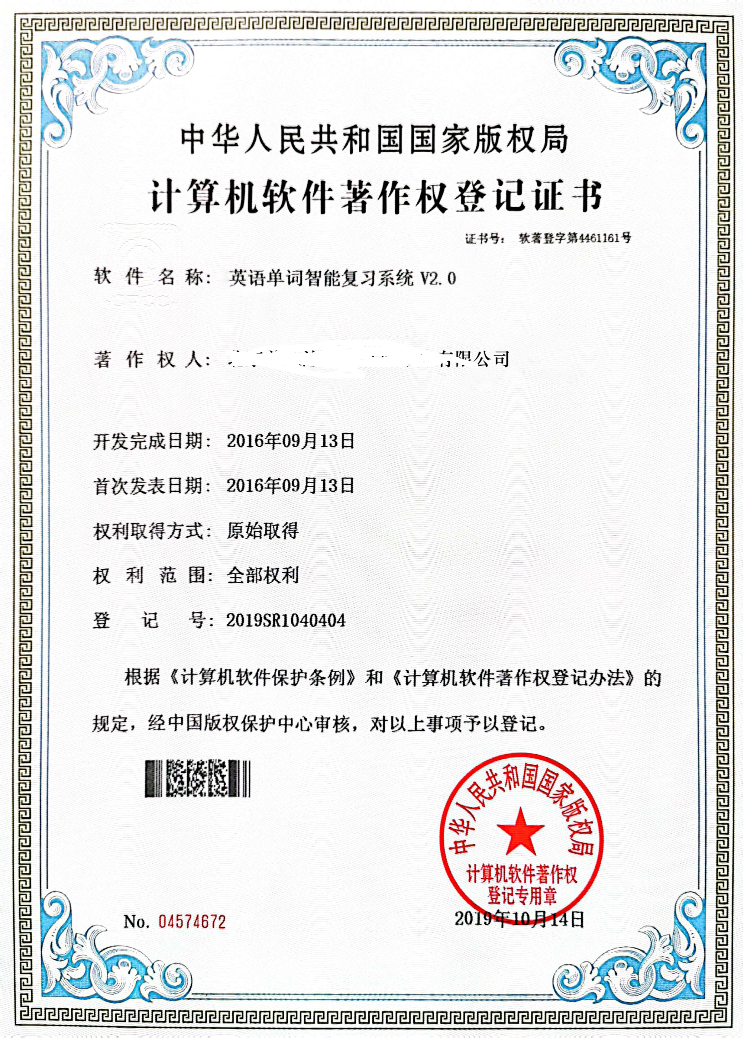 闪电背单词拥有18项完全自主知识产权的计算机软件著作权,是行业早期的背单词系统软件著作权登记凭证。