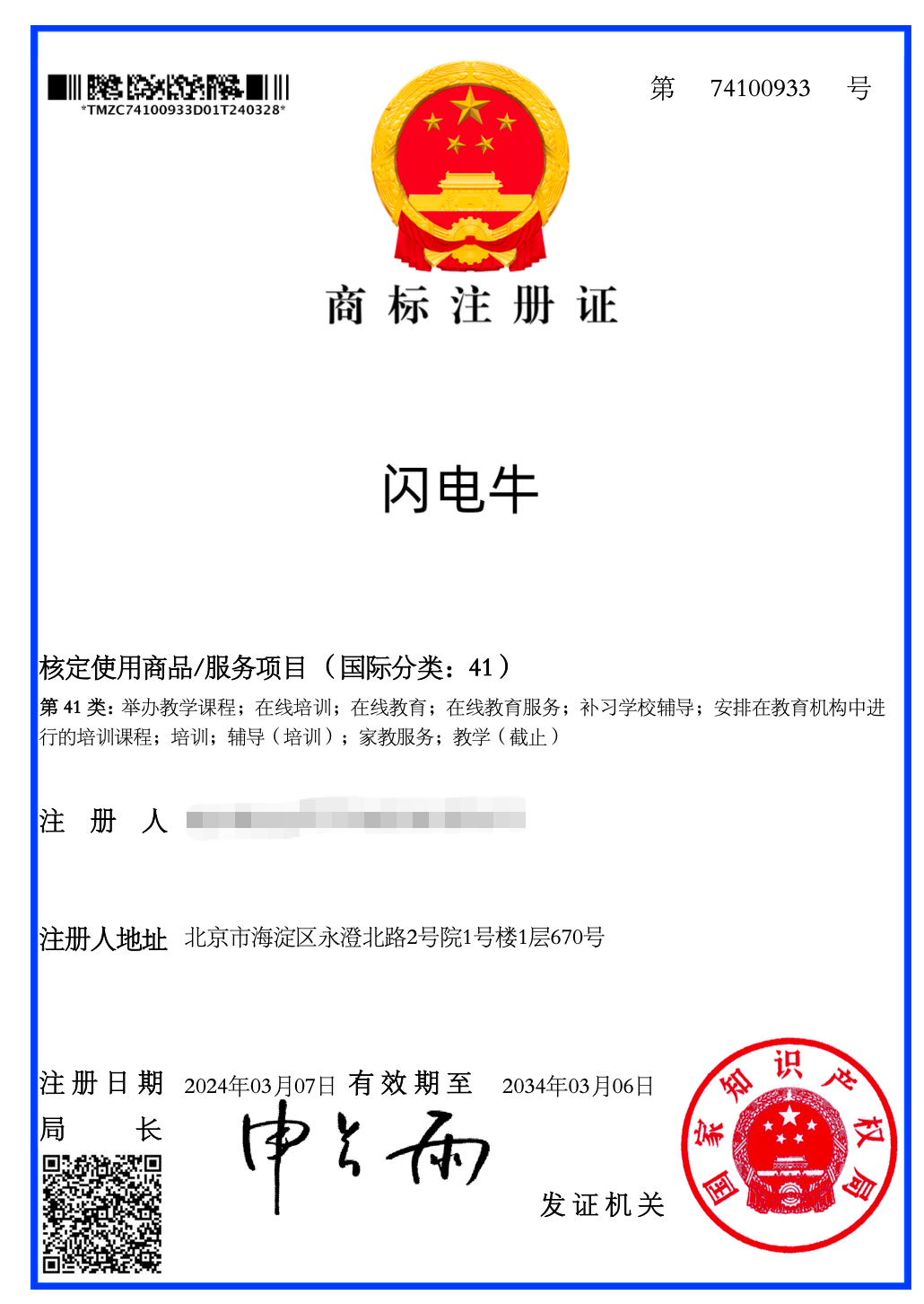 闪电背单词已注册商标「闪电牛」,拥有完整的品牌知识产权保护。